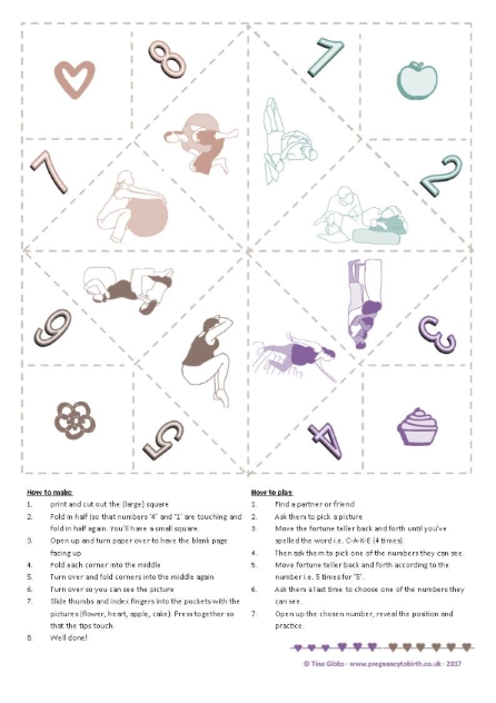 Fortune-Tellers/cootie catchers to practice for labour and birth! This is a set of 4 fortune-tellers which you can print at home as often as you like to pass on to parents-to-be in your classes. Alternatively, you can send them out to parents via email and they can print their own.